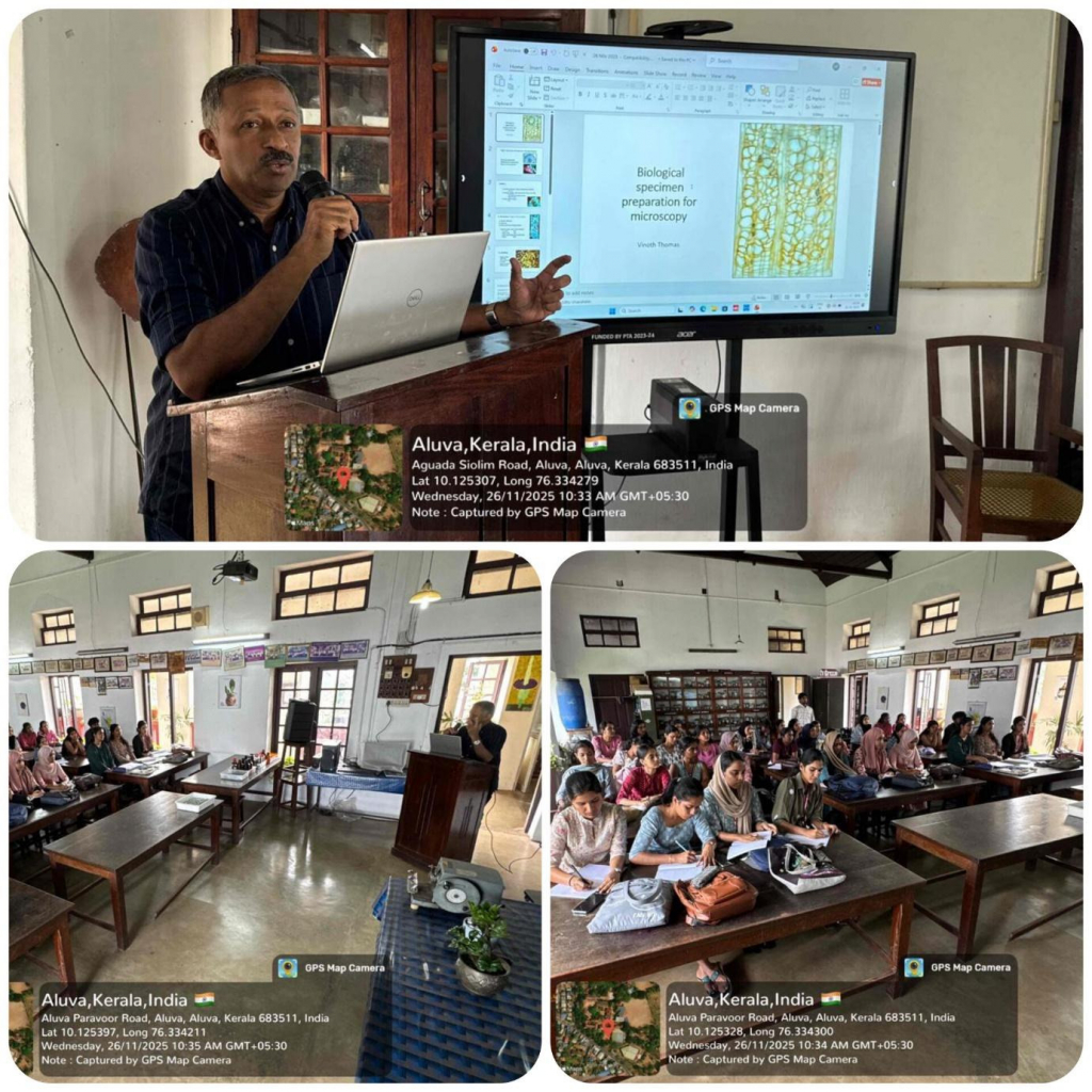 A one-day hands-on intercollegiate workshop on Biological Specimen Preparation for Microscopy was conducted on 26 November 2025 at the Botany Laboratory of Union Christian College, Aluva. The programme aimed to equip post graduate level students with practical skills in preparing high-quality biological specimens for microscopic observation, thereby strengthening their laboratory competencies and scientific understanding.